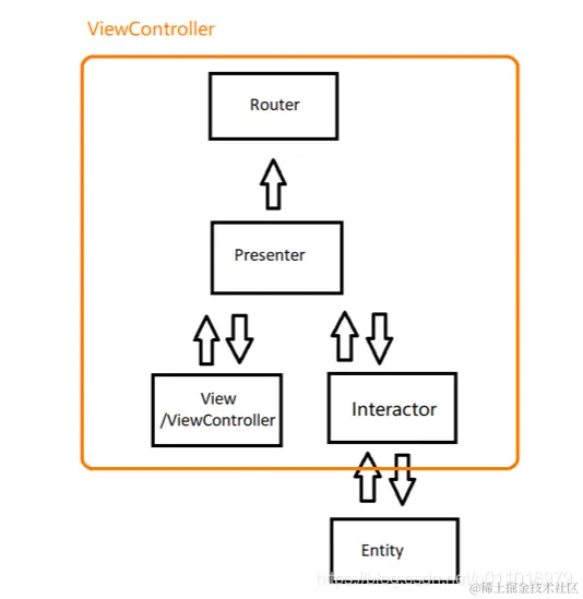 负责视图控制器的渲染,比如将数据展现到每个控件。以及单数据被改变后 UI 的刷新。 Presenter 呈现器是中枢神经,因为整个 VIPER 链都要通过它串联起来,比如说 View 和 Interactor 都会和它进行双向绑定,即互相引用。