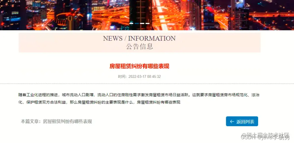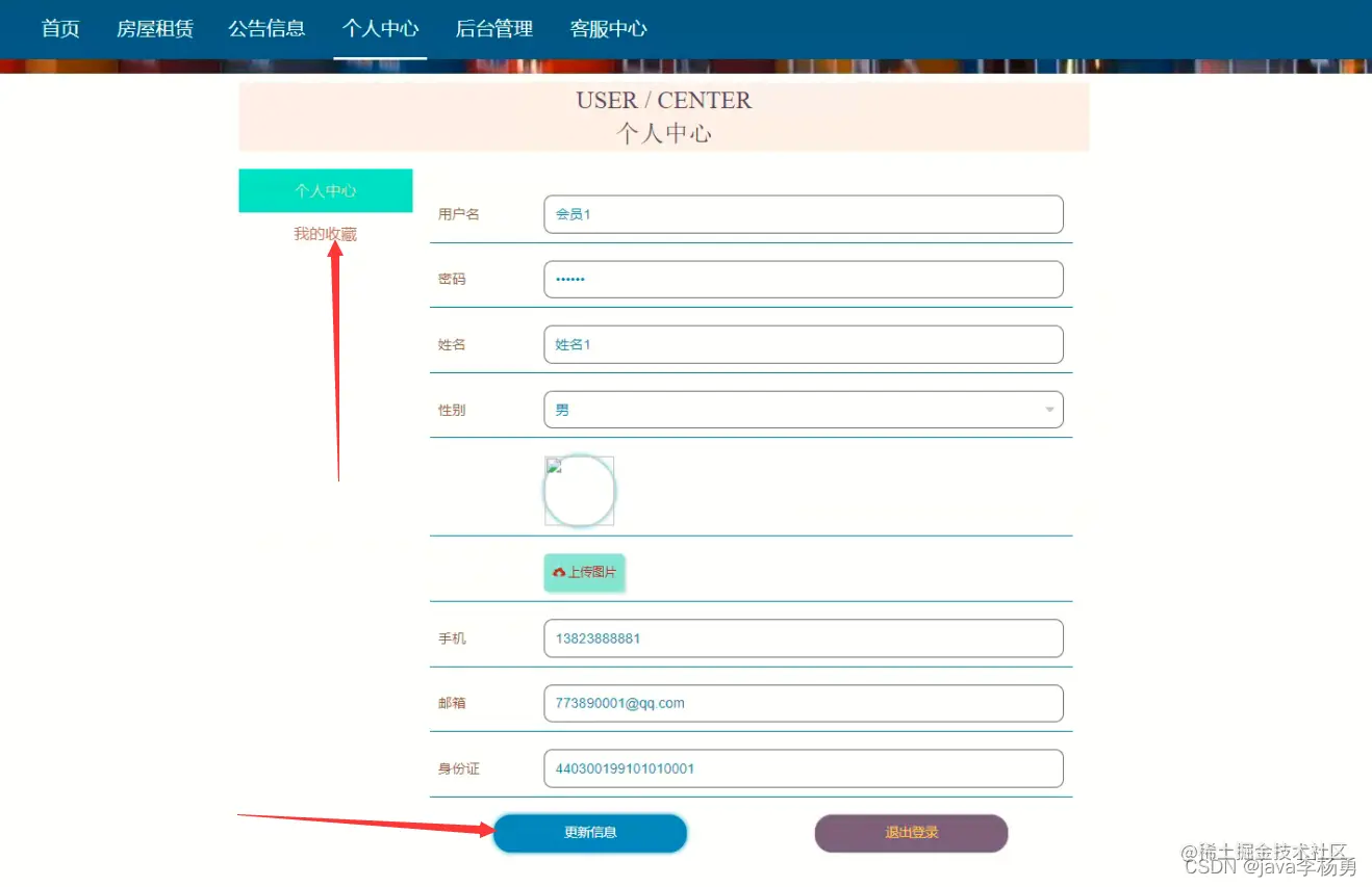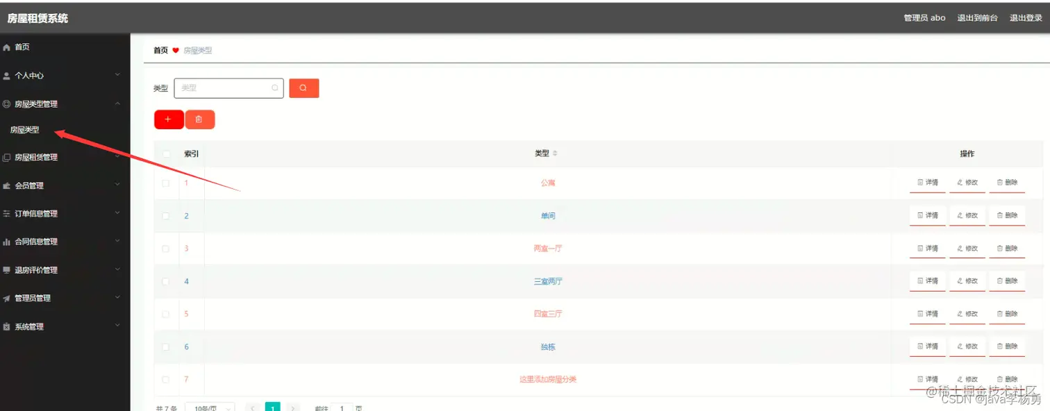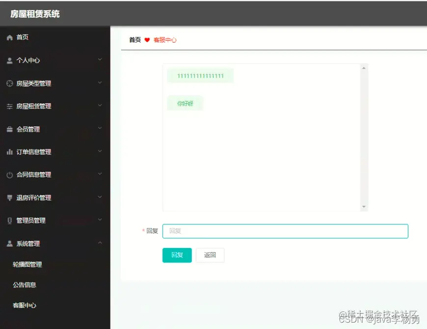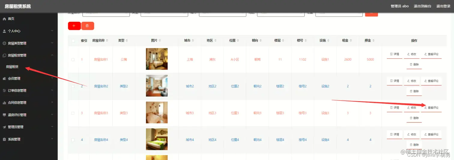 主要功能实现:首页、个人中心、房屋类型管理、房屋租赁管理、会员管理、订单信息管理、合同信息管理、退房评价管理、管理员管理,系统管理等基本功能