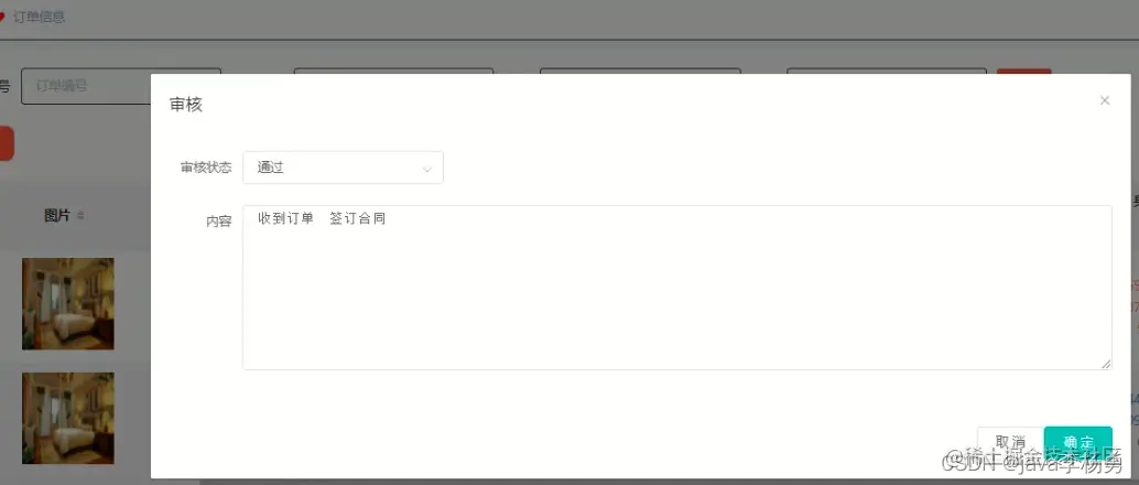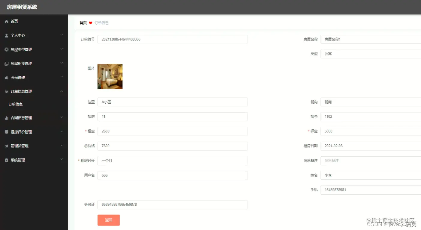 订单管理: 订单信息管理,在订单信息管理页面中可以查看订单编号、房屋名称、类型、图片、位置、朝向、楼层、楼号、租金、押金、总价格、租房日期、租房时长、信息备注、用户名、姓名、手机、身份证等信息,并可根据需要对已有订单信息管理进行修改或删除等详细操作