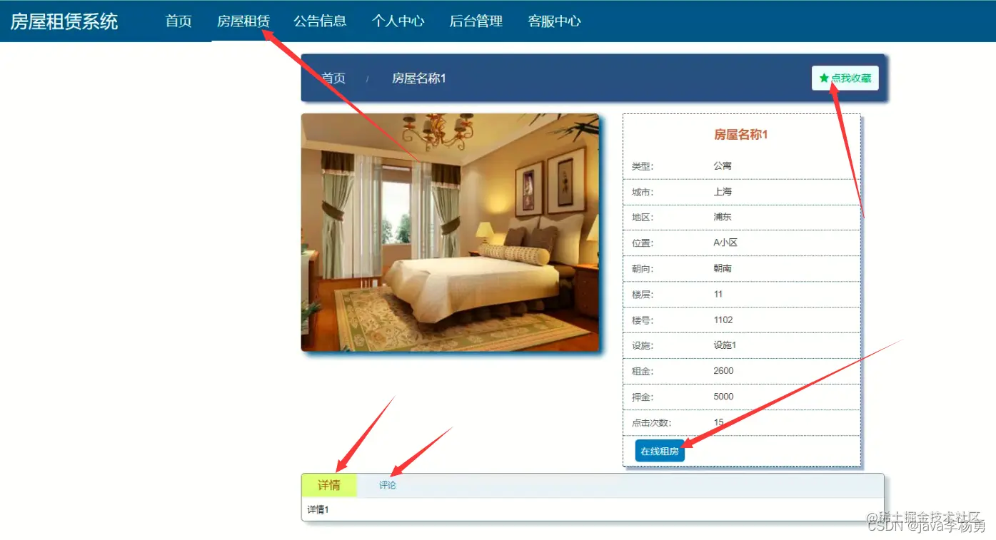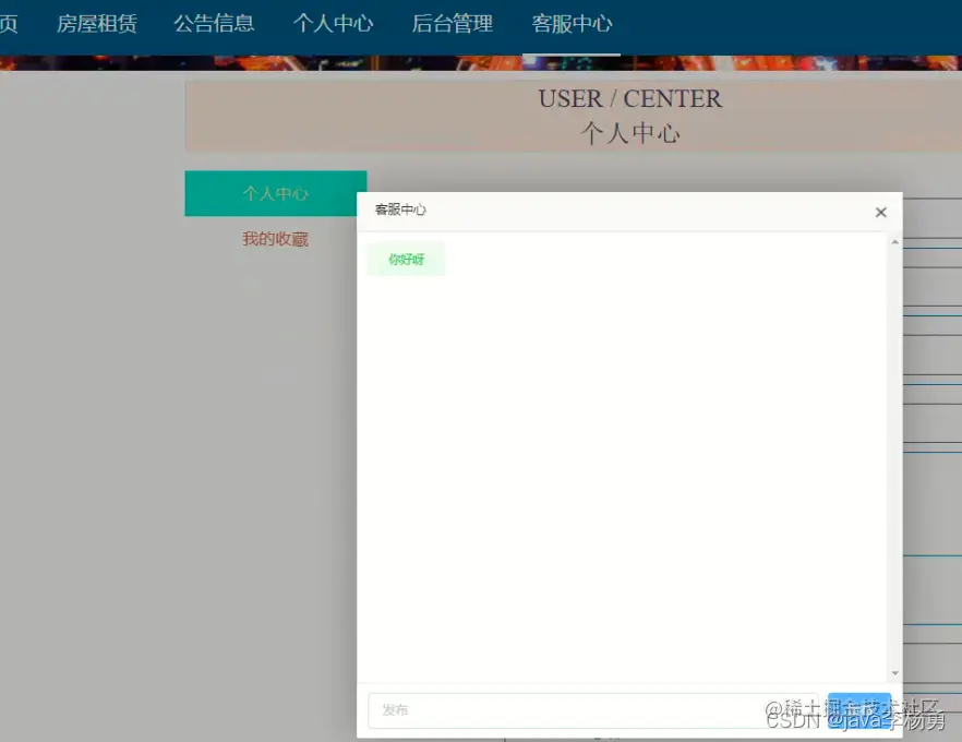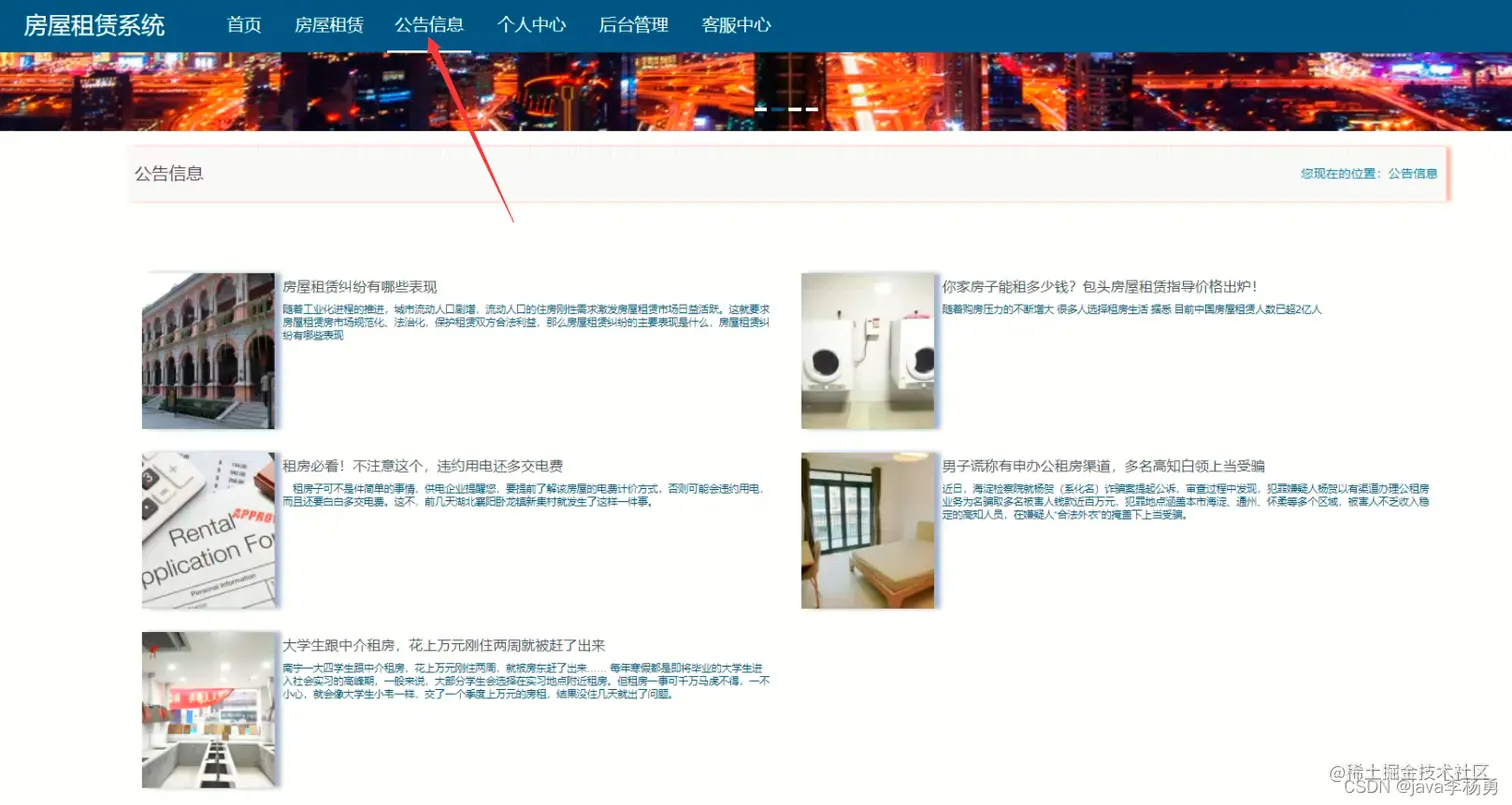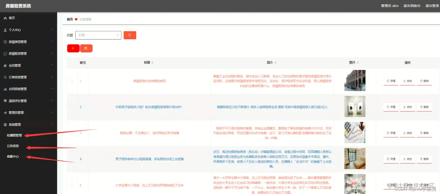 系统首页: 在系统首页可以查看首页、房屋租赁、公告信息、个人中心、后台管理、客服中心等内容