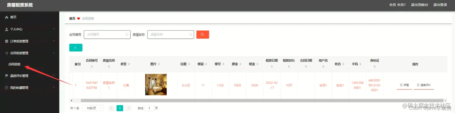 合同管理: 合同信息管理,在合同信息管理页面中可以查看合同编号、房屋名称、类型、图片、位置、楼号、租金、押金、租房日期、租房时长、合同日期、用户名、姓名、手机、身份证等内容,并且根据需要对已有合同信息管理进行详情,修改或删除等详细操作
