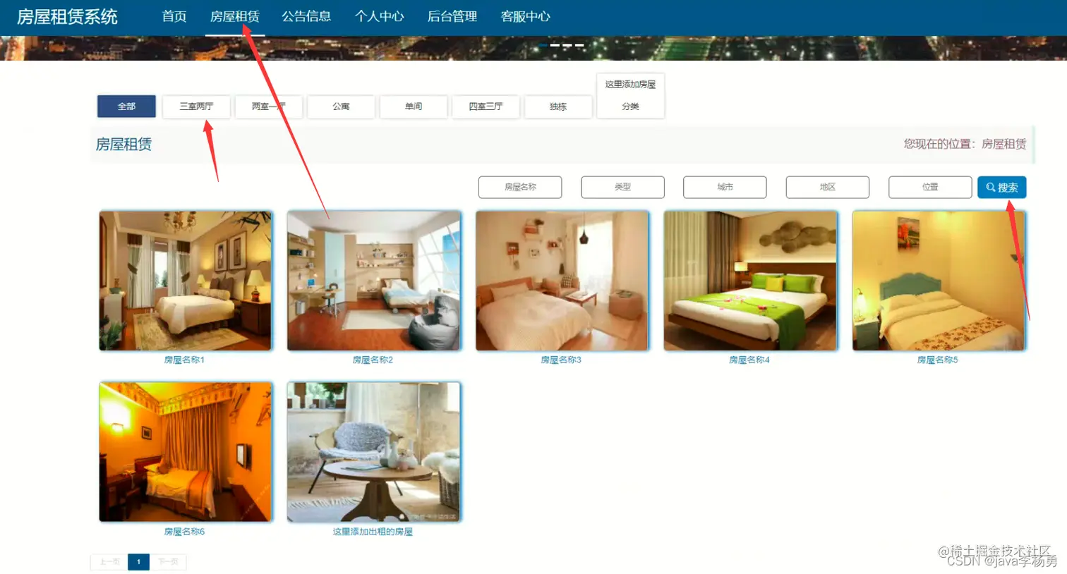 房租租赁: 在房屋租赁页面通过填写房屋名称、类型、图片、城市、地区、位置、朝向、楼层、楼号、设施、租金、押金、点击次数等信息进行提交