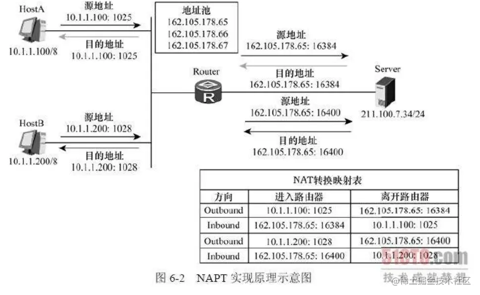 而最常见的其中一种技术就是 NAPT,也叫“网络端口地址转换”。因为一般一个服务都是通过一个端口来提供,因此通过这种方式可以将特定的服务通过特定的规则开放到少量的公网 IP 上。