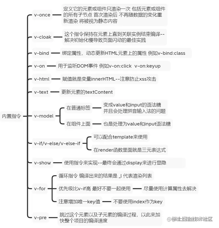 - v-once - 定义它的元素或组件只渲染一次,包括元素或组件的所有节点,首次渲染后,不再随数据的变化重新渲染,将被视为静态内容。