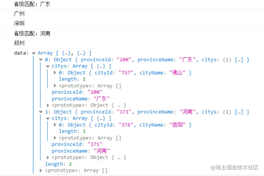 - 其实,过滤的数组arrFilter和初始的数组addressData,格式完全一致最好,datab[i2].cityId == arrb[j2]这里的判断就可以改为一致的了,这里仅仅作为示例,不再修改了。