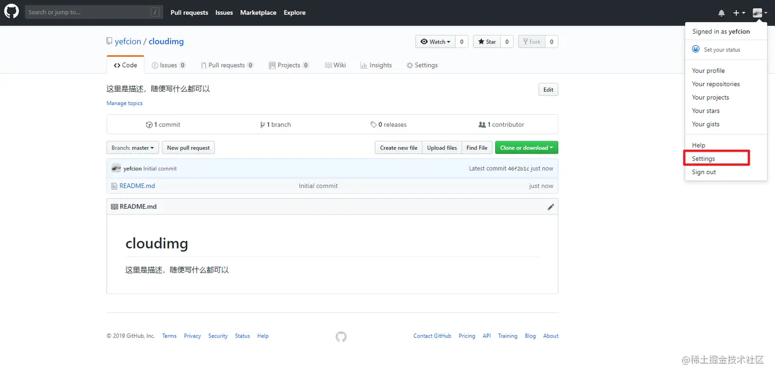 此时仓库已经建立,点击右上角头像,然后进入设置;