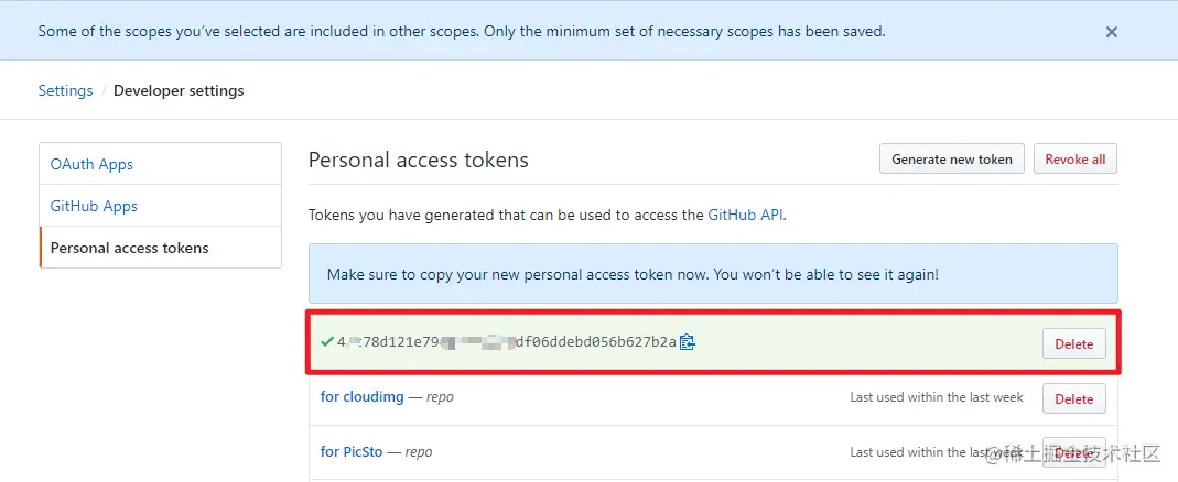 然后复制生成一串字符 token,这个 token 只出现一次,所以要保存一下(我一般记在微信收藏)。