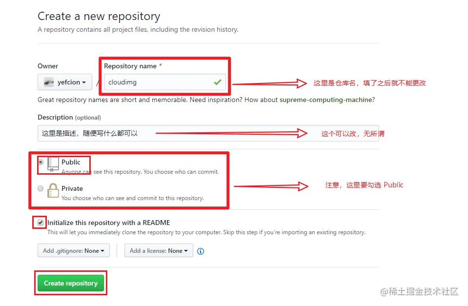 填写仓库信息,例如我就创建了一个 cloudimg 的仓库。这里注意,仓库得设置为 Public 因为后面通过客户端访问算是外部访问,因此无法访问 Private ,这样的话图片传上来之后只能存储不能显示。所以要设置为 Public。