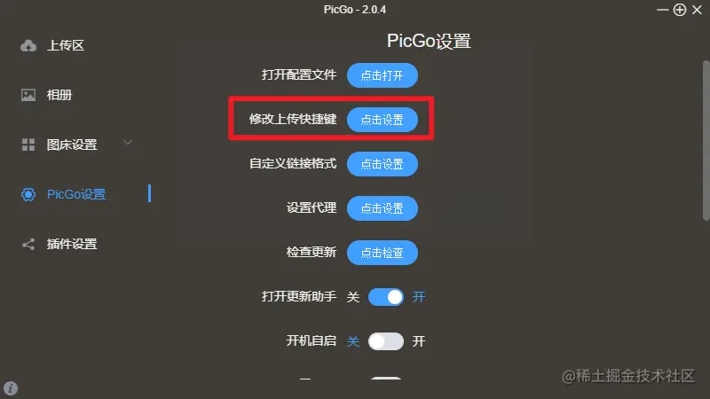 然后关于上传的快捷键设置。默认的是 Mac 按键,推荐改成 Ctrl + alt +c 。