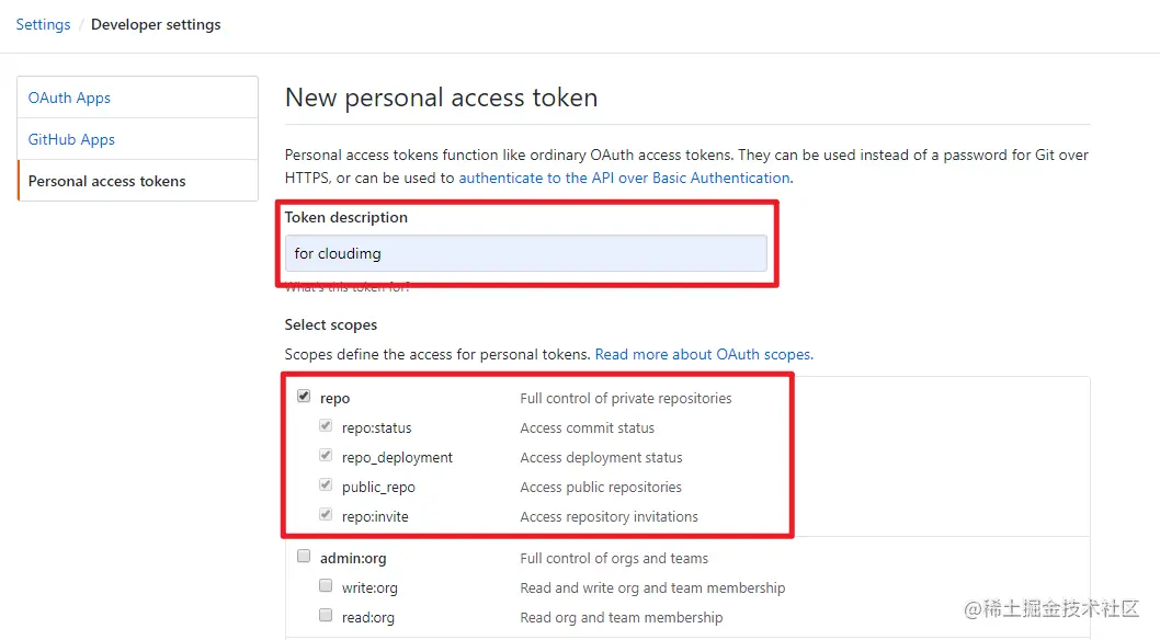 填 description(也是随心填),勾选复选框 repo ,接着到页面底部