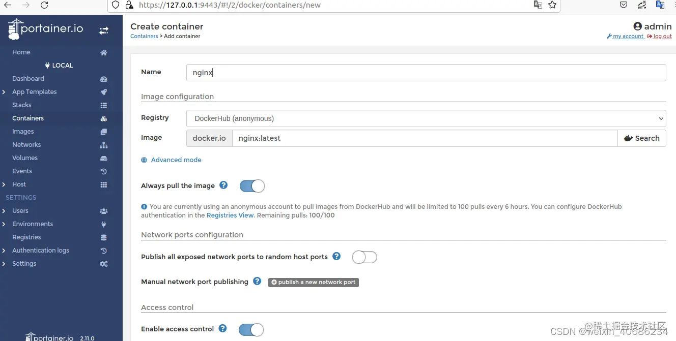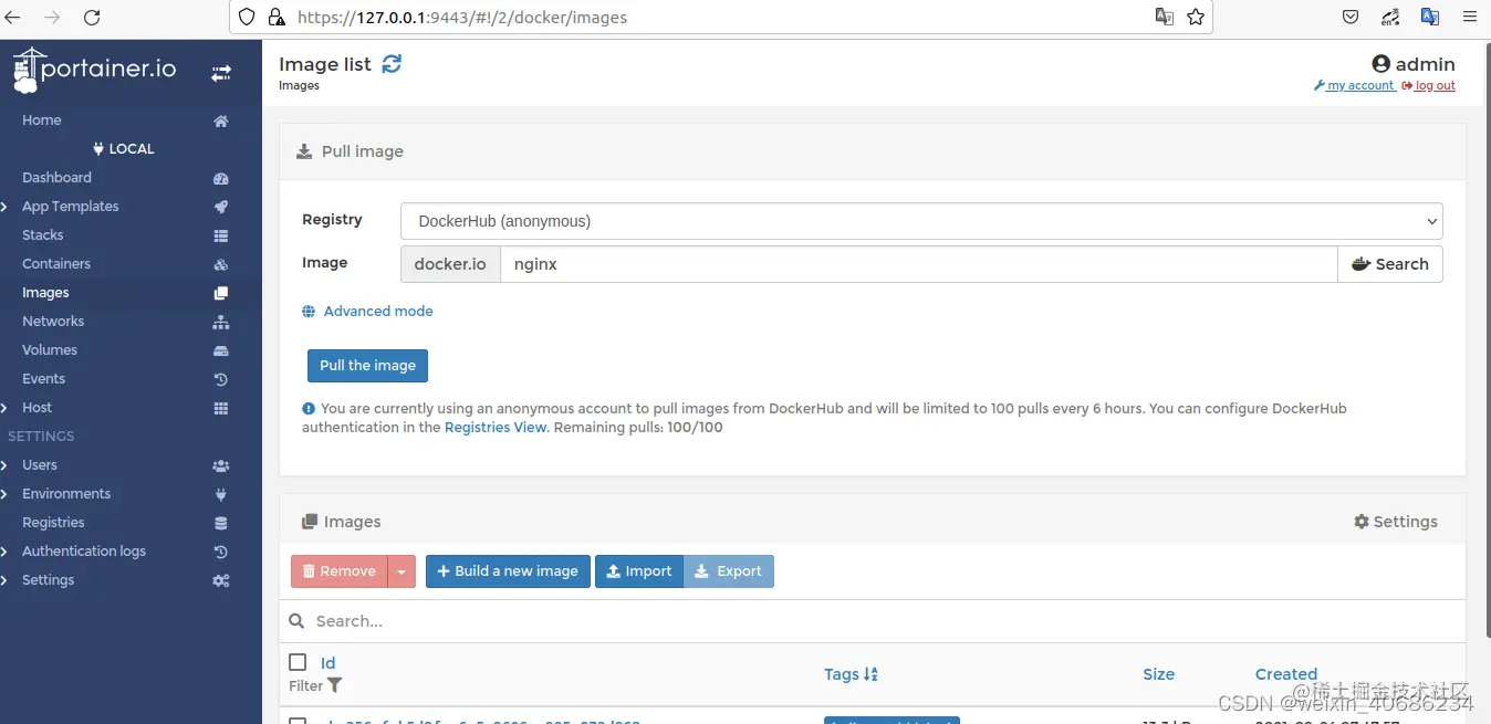 Portainer 点击 Images 镜像,docker.io 右侧填入 nginx,点击 Pull the image 下载镜像