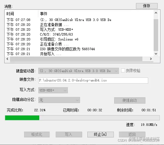 5.选择格式U盘,选择写入方式为USB-HDD+,点击写入,等待写入完成。