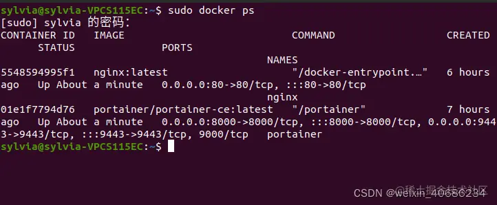 8.查看 Docker 容器状态(NAMES 标签出现 portainer/portainer-ce 则成功运行)
