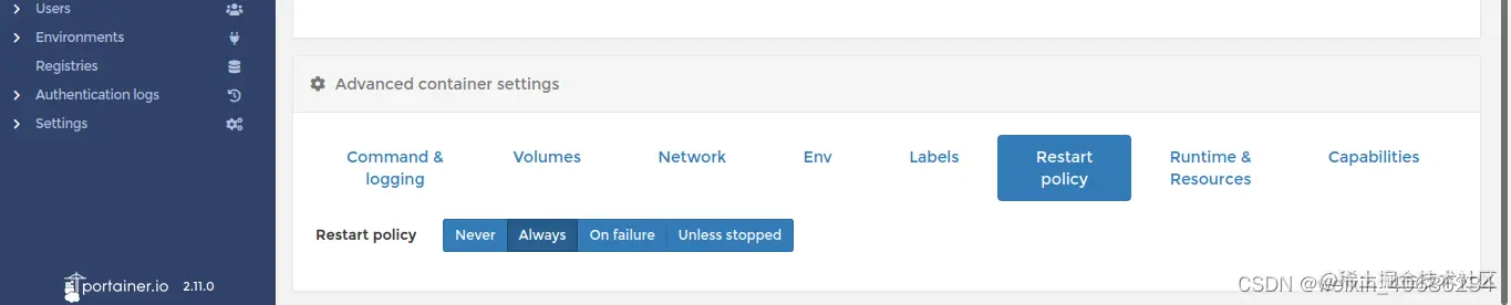 5.Restart policy 重启策略调整为 Always 永远自动启动。