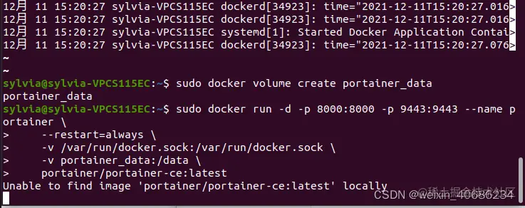 sudo docker run -d -p 8000:8000 -p 9443:9443 --name portainer \ --restart=always \ -v /var/run/docker.sock:/var/run/docker.sock \ -v portainer_data:/data \ portainer/portainer-ce:latest