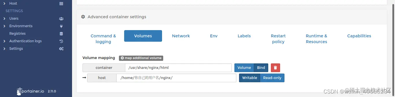 在Advanced container settings高级容器设置中,点击map additional volume 映射附加卷,点击绑定文件夹及可读写,本地文件夹填入 /home/你自己的用户名/nginx/ 容器文件夹填入 /usr/share/nginx/html