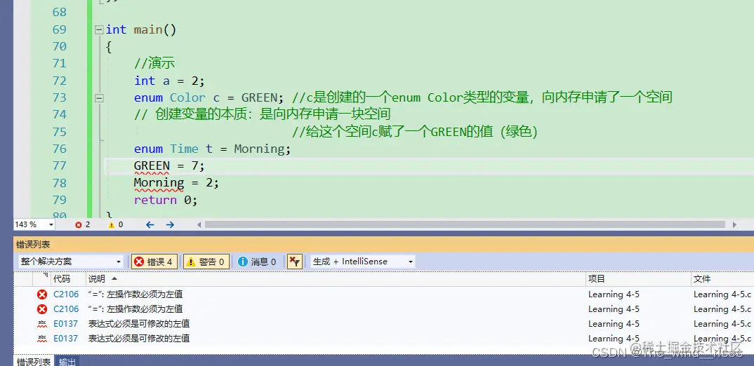 enum Color c = GREEN; //c是创建的一个enum Color类型的变量,向内存申请了一个空间
