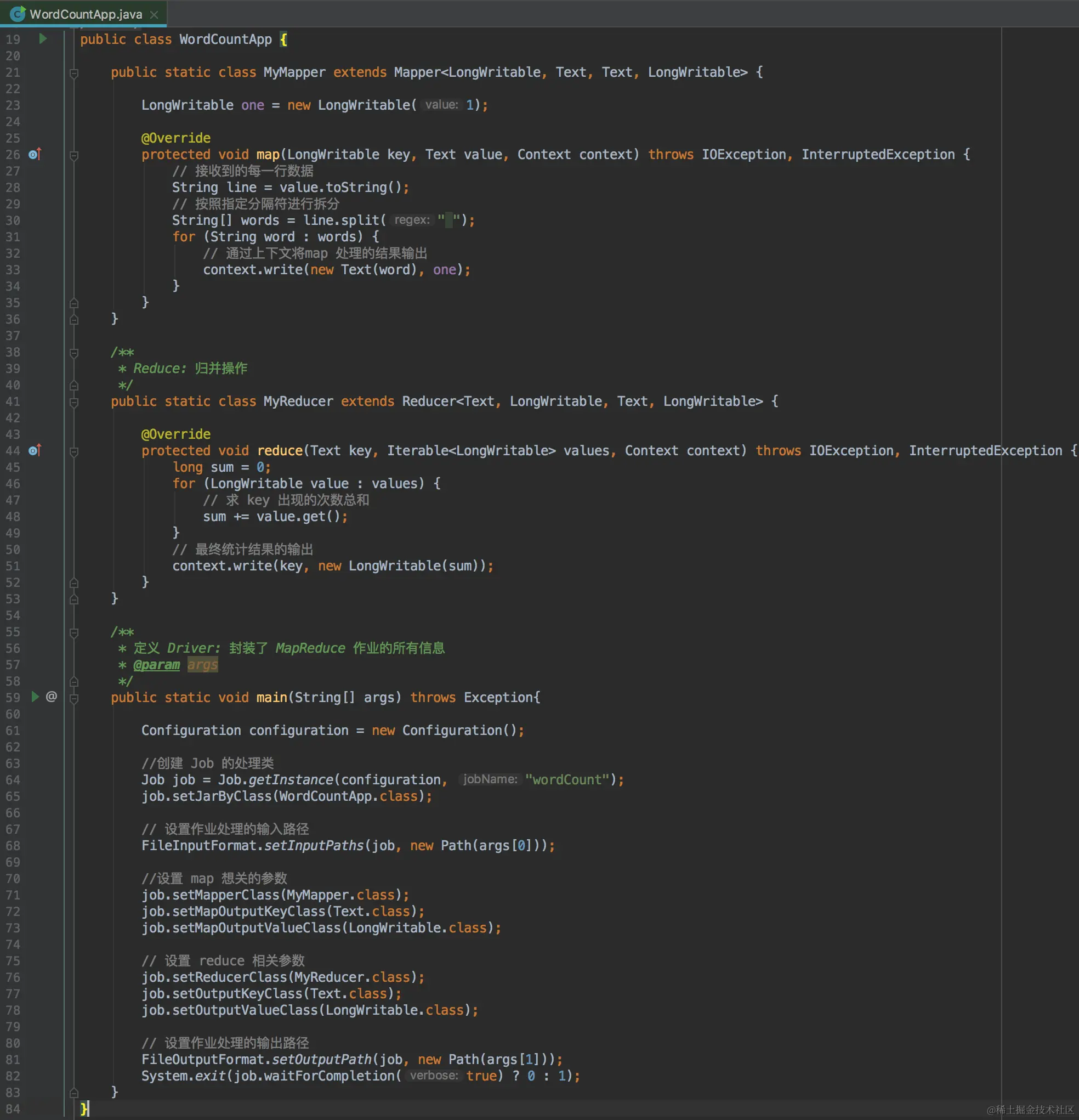 MapReduce版本WordCount程序的核心是map、reduce函数。