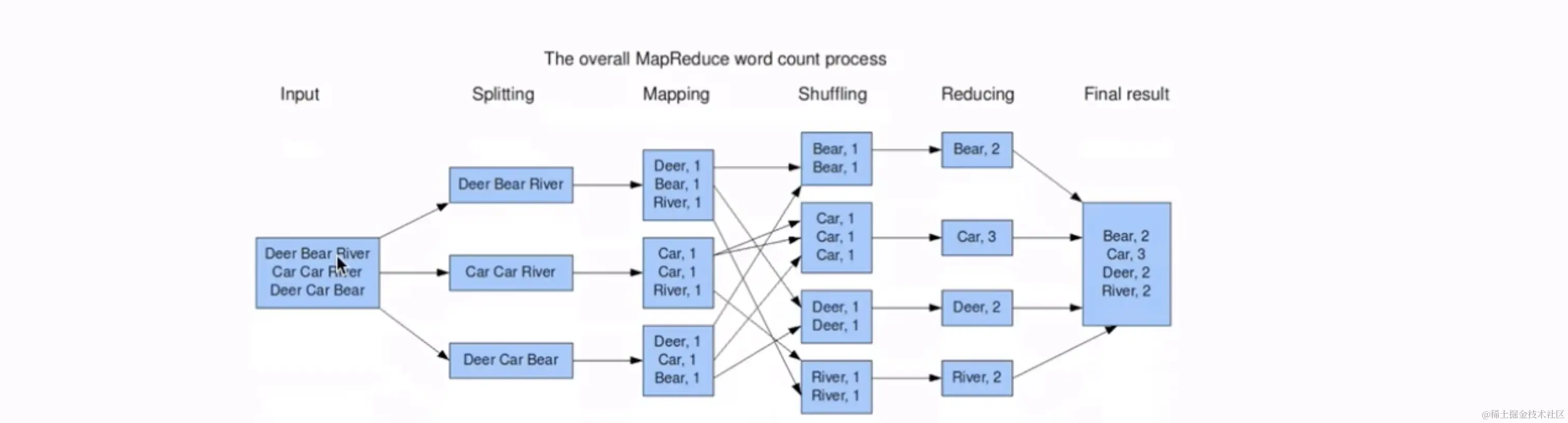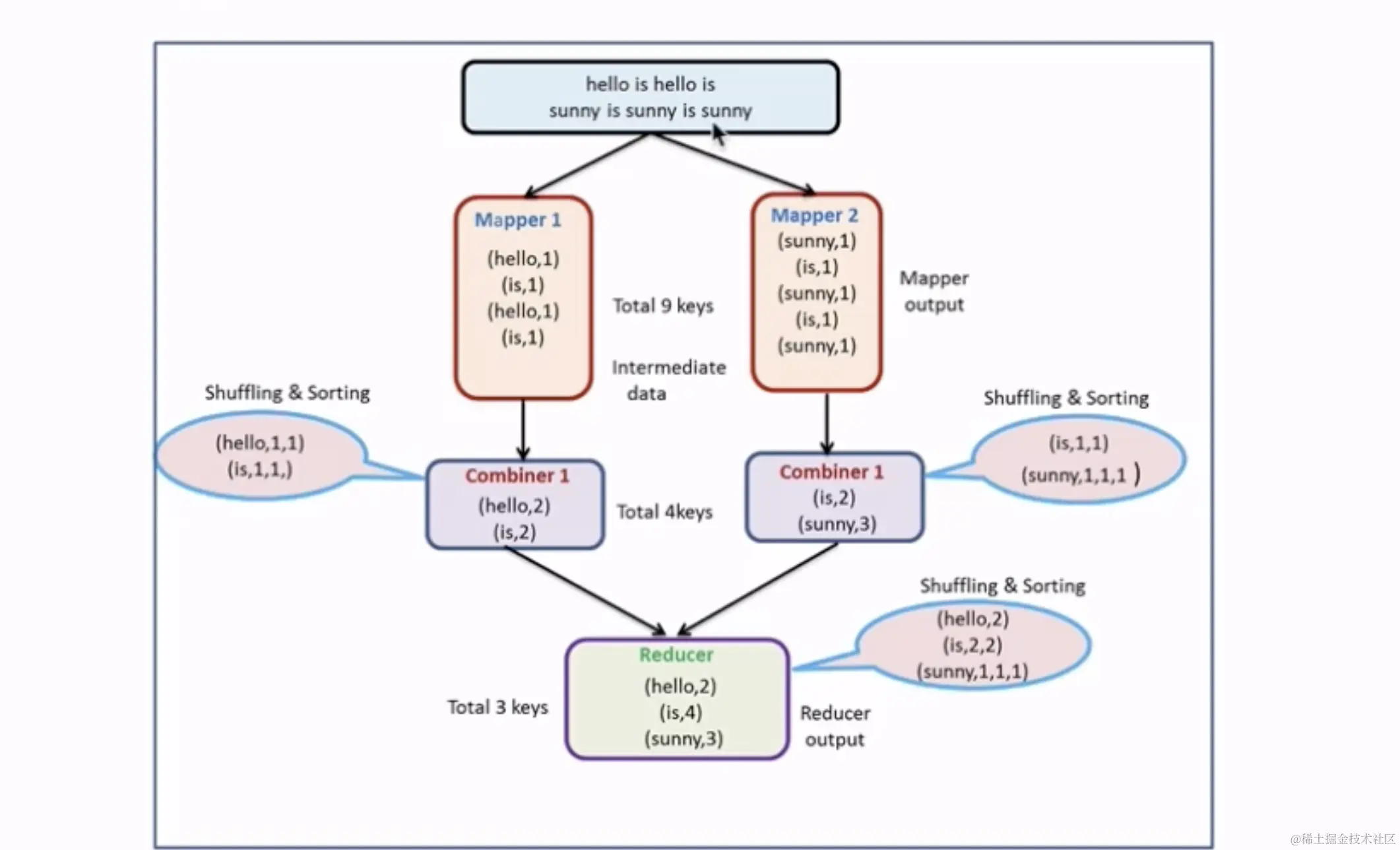 map函数的计算过程是,将这行文本中的单词提取出来,针对每个单词输出一个<word, 1>这样的KV对。