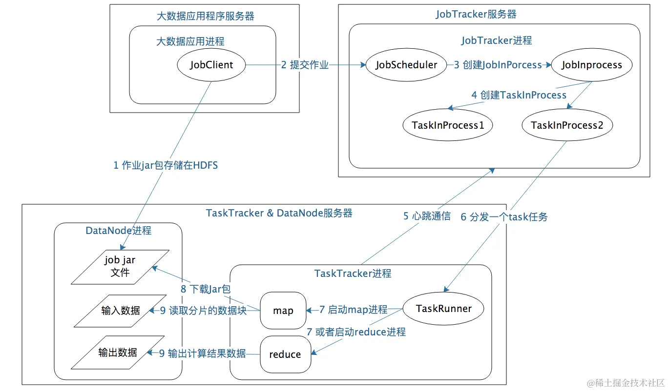 1、应用进程JobClient将用户作业jar包存储在HDFS,这些JAR包后续会分发给Hadoop集群中的服务器执行MapReduce计算