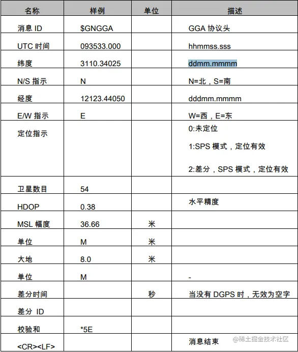以这个数据可以解析为,位置,北纬33度52.18138分,东经115度28.75505 - 剩余信息根据手册进行使用,对日常的开发用处较少,下面将GGA的数据格式分享出来。