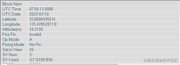 - 从图中可以看到卫星定位的消息,比如现在的时间,经纬度等,我们主要需要的信息就是在这里显示。以下图为例,此模块的测试时间就是以世界统一时间为标准的2022年3月10日7点56分13秒。经纬度为: