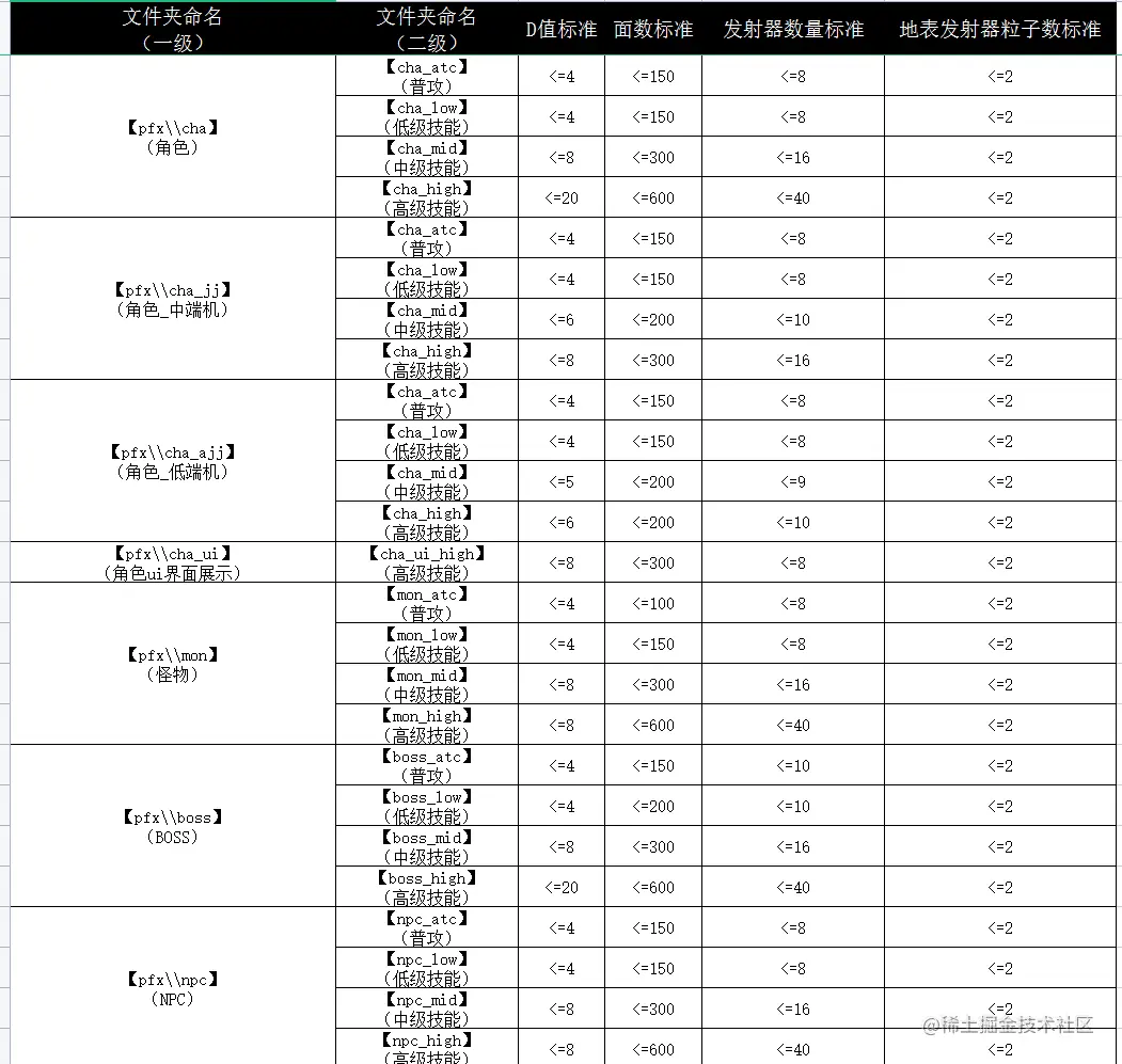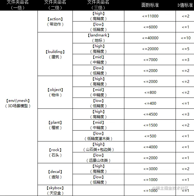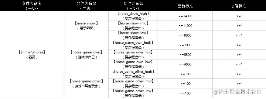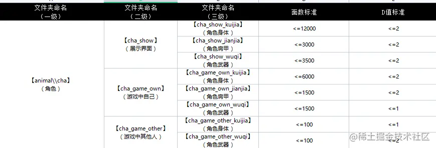 在项目研发前期与美术制定好各种情形下的制作规范是至关重要的,在一个约定的范围内制作资源,可以很大程度地避免后期大面积返工现象,也让美术人员有一定的性能意识,这对提升团队整体的开发效率是至关重要的。下面是我们之前制定资源的部分资源制作标准。