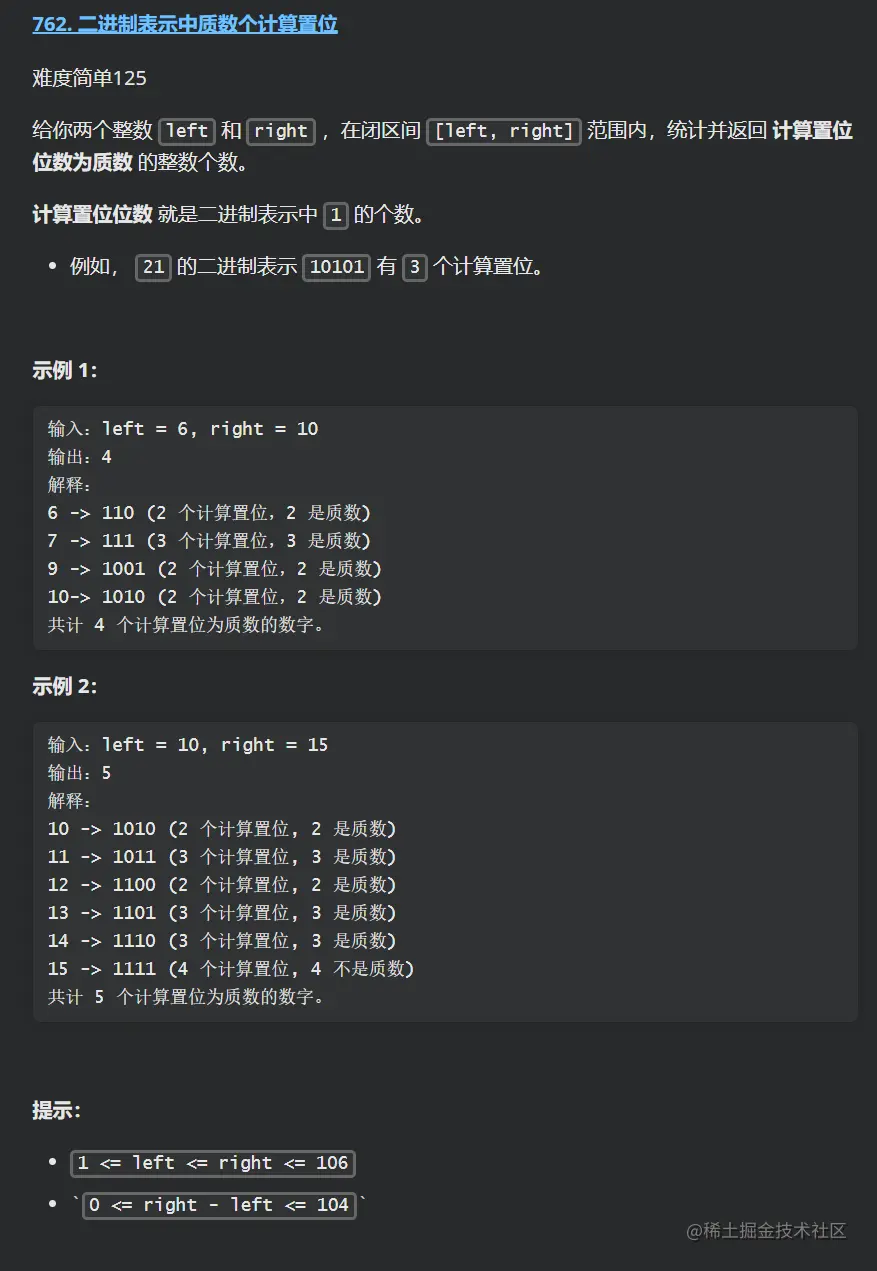 本次刷题日记的第 25 篇,力扣题为:762. 二进制表示中质数个计算置位 ,简单