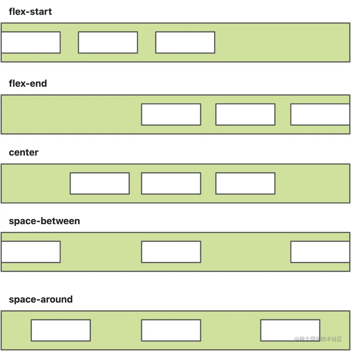 justify-content: flex-start | flex-end | center | space-between | space-around