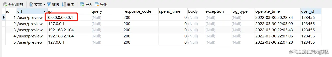 需要注意的是,自己本地开发,基本都是通过使用 [ localhost ]标准主机名来进行接口访问的,对吧,那么你就会特别好奇,数据库记录日志 ip 这一栏,ip有的竟然是 0:0:0:0:0:0:0:1。