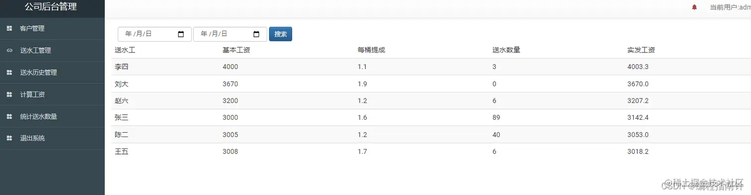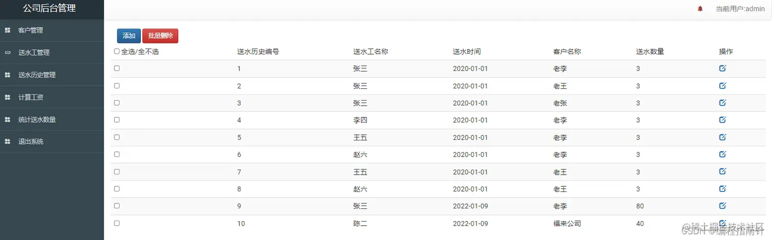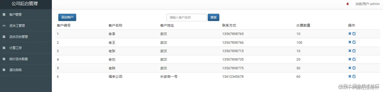 基于Springboot实现送水公司信息管理 java包哥 2022-04-06 114 阅读1分钟 本文己参与[新人创作礼]活动,一起开启掘金创作之路 项目编号:BS-XX-014 项目描述 springboot实现的送水后台管理系统 运行环境 jdk8+tomcat7+mysql+IntelliJ IDEA+maven 项目技术( 必填) SpringBoot+mybatis 数据库文件( 可选) 压缩包自带 依赖包文件( 可选) maven项目 项目运行截图: 系统主界面 客户管理 送水工管理 送水历史订单 工资计算 统计送水数量 \