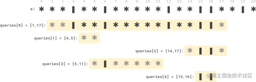Input: s = "***|**|*****|**||**|*", queries = [[1,17],[4,5],[14,17],[5,11],[15,16]]