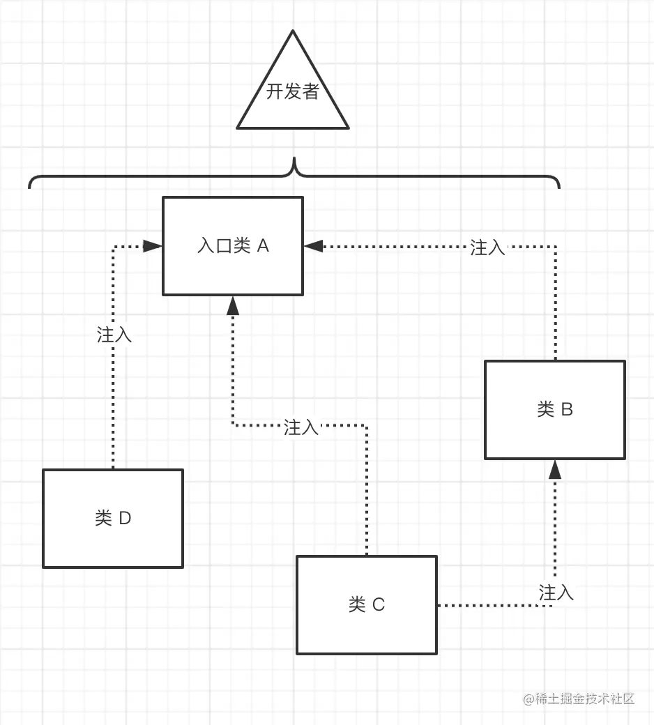 这种方式就是依赖注入,把 B 所依赖的 A,通过传值的方式注入到 B 中。通过构造函数注入(传值)只是一种实现方式,也可以通过实现 set 方法调用传入,或者是其他任何方式,只要能把外部的一个依赖,传入到内部就行。其实就这么简单。