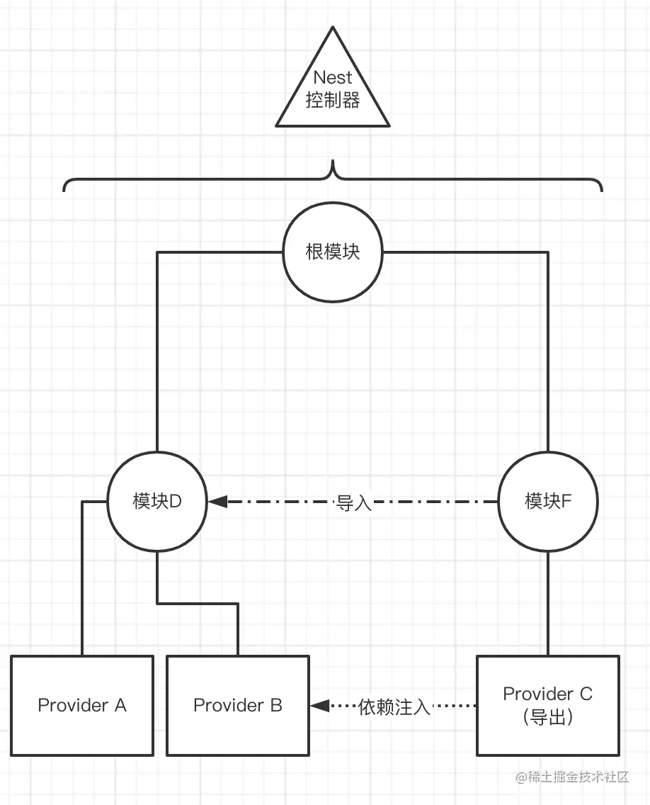 按照下面的写法,控制反转程序会自动扫描依赖,首先看自己模块的 providers 中,有没有提供者 A,如果没有就去寻找导入的 ModuleD 中是否有 A 实例,发现存在,就取得 ModuleD 的 A 实例注入到 C 实例之中。