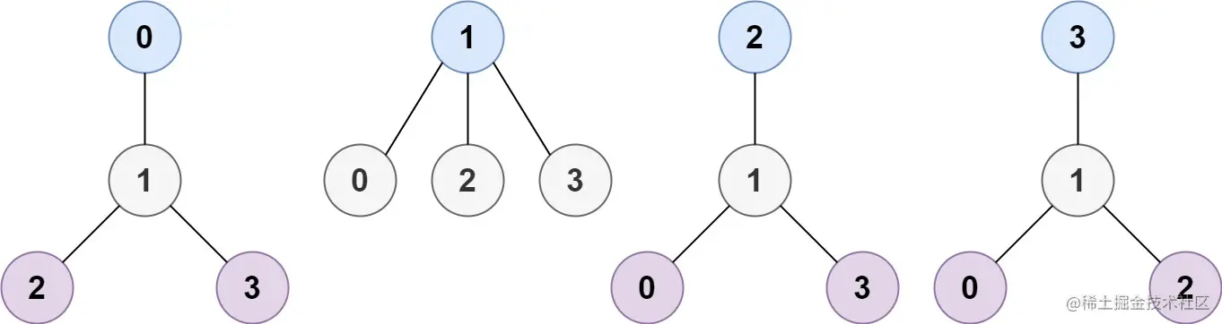 可选择树中任何一个节点作为根。当选择节点 作为根节点时,设结果树的高度为 。在所有可能的树中,具有最小高度的树(即,min(h))被称为 最小高度树 。