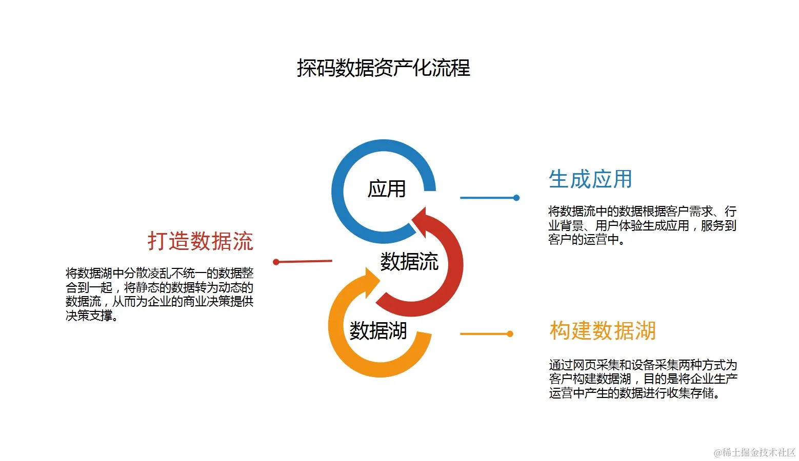 - 构建数据流:将数据湖中的数据经过抽取、清洗、脱敏脱密转换之后进行存贮,目的是将企业中的分散、零乱、标准不统一的数据整合到一起,将静态的数据湖转化为动态的数据流从而为企业的商业决策提供时时分析。