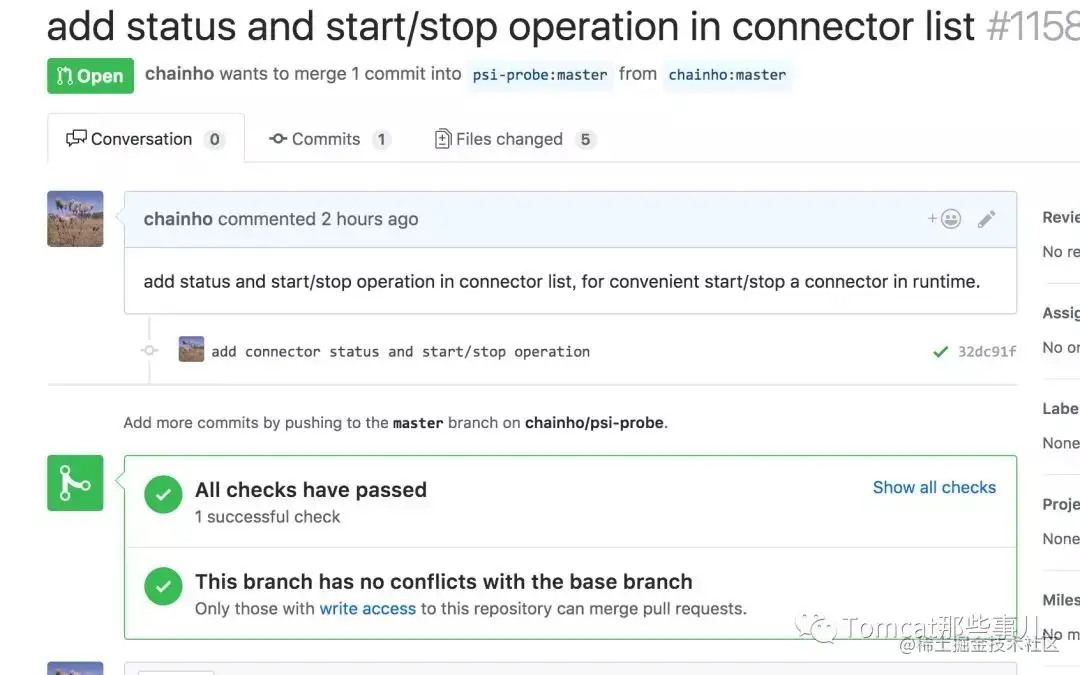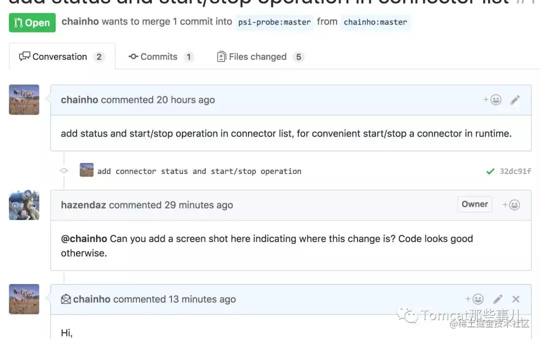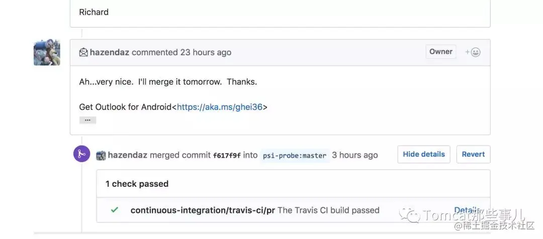 等待 Commiter review 没问题之后,会将本次内容,合并到源仓库的指定分支中,此时PR中会显示xxx merge commit 到什么分支,同时PR的状态是「Closed」。此时,本次参与已经完成。