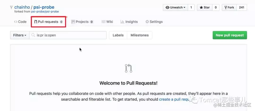 此时,在你仓库中点击「Pull Request」,会显示对于「你这个项目」,别人发起的 Pull Request。我们现在是想向「源仓库」提交代码,所以再点击右上方绿色的「New pull request」按钮。