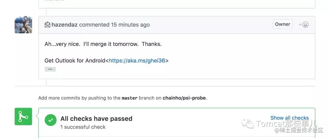 等待上述「代码检查」与「持续集成」完成,没有问题时,图标会变成绿色。此时,「源仓库」的维护人,Commiter,就可以将你提交的内容合并到源分支中。
