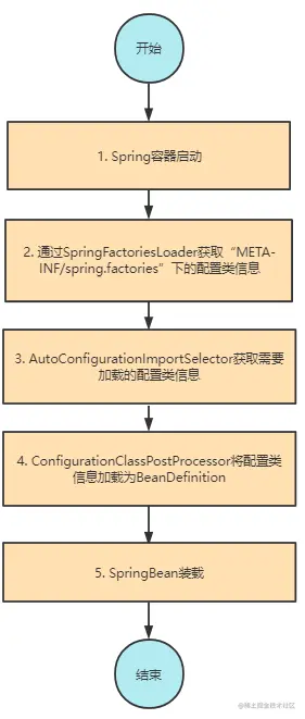 在 Spring SPI 中,也有一个类似于 ServiceLoader 的类——SpringFactoriesLoader,在 Spring 容器启动的时候,会通过 SpringFactoriesLoader 去“META-INF/spring.factories”获取配置类信息,然后将这些配置类信息封装成 BeanDefinition,这样 Spring IoC 容器就能管理这些 Bean 了,主要流程如下: