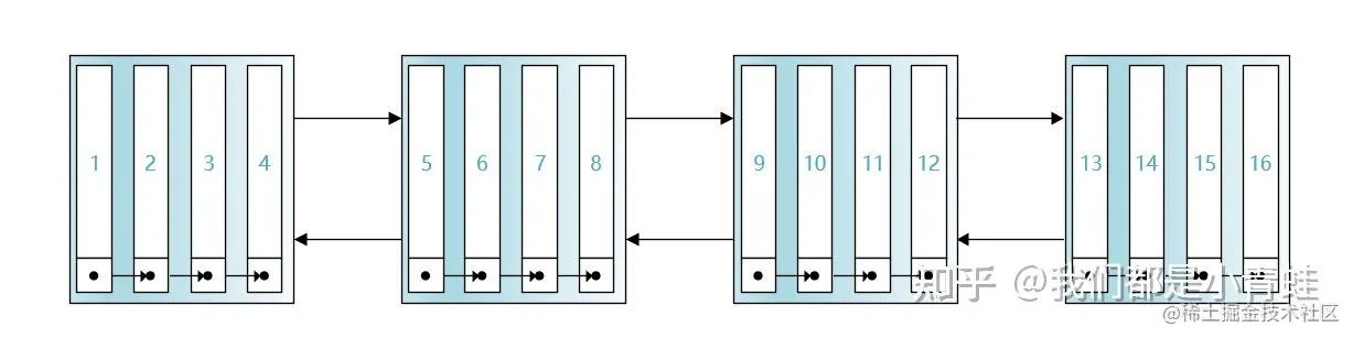 现在我们做一个大胆的假设:假设一个页里只能存储4条记录,然后有16条记录分散在4个页里,页之间按照它们中存储的主键值进行排序为双向链表,如下图所示: