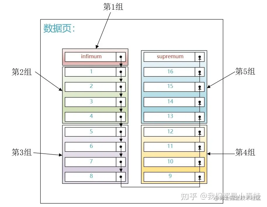 为了解决快速搜索的问题,设计InnoDB的大叔引入了一个称作页目录的东西。具体的做法就是将单向链表中的记录分成若干个组,如下图所示:
