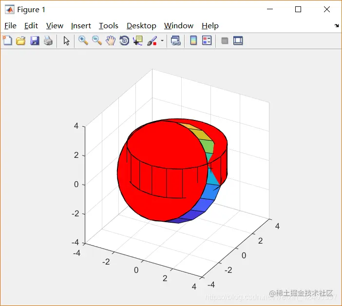 surf(x,y,z,'FaceColor',[1,0,0]); %使用surf功能将x,y,z的数据导入。FaceColor即设置圆柱体颜色,红色色号为[1,0,0]