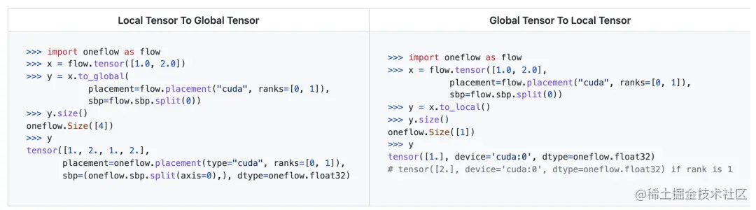 - Global Tensor 可以使用 Tensor.to_local 接口返回它在当前节点的本地分量。