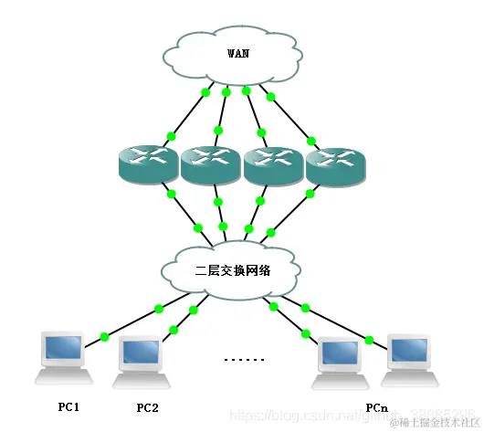 若这些PC的ip都在同一个子网内,那给这个子网分配一个网关备份组(组编号)将若干路由器(不同协议有数量限制)加入到这个组中给这个组分配唯一的一个虚拟ip(即该子网内随便一个主机号),系统给这个组自动分配一个虚拟mac(注:虚拟ip可以与路由器接口真实ip在同一子网,也可以是接口真实ip所在子网下再划分的子网的主机号~)。将每台PC的网关ip都手动设置成这个虚拟ip(因为在交换层“寻路”都是通过mac地址,PC解析这个ip时,备份组回复给它虚拟mac值,同时备份组告诉交换机这个虚拟mac指向active/master)(!!!二层交换机“寻路”依靠mac地址表中的三个条目:PC的mac,网关接口mac,邻居交换机接口mac),由此PC向外通讯都将数据帧中目的mac字段值写为该虚拟mac。
