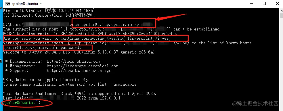 接着打开其他系统(此处我们使用的是Windows系统)的命令行界面,输入命令“ssh cpolar@1.tcp.cpolar.io -p XXXXX(cpolar生成的端口号)”。此处需要注意的有两点,一是在数字端口号之前,一定要添加“(空格)-p(空格)”,否则是无法连接隧道的;二是“ssh cpolar@”之后,要输入复制客户端生成的tcp地址。在输入正确的命令后,Ubuntu会出现提示信息,询问是否确定连接该端口,并要求输入Ubuntu系统的密码,此时分别输入“yes”和ubunt系统密码即可。