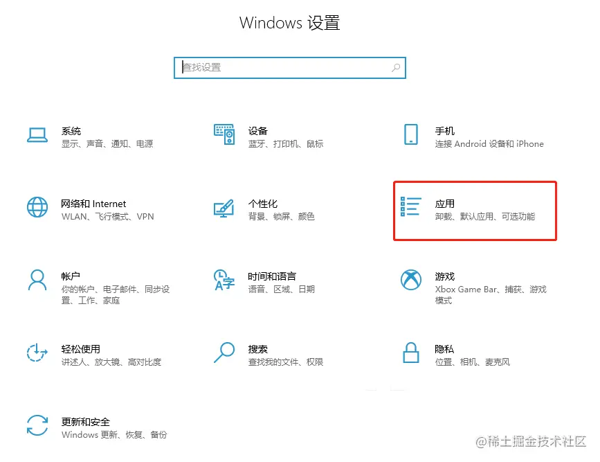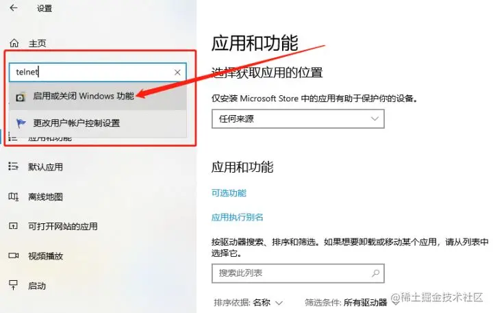 在“应用”的搜索栏中输入“telnet”,查找Windows内的相关功能