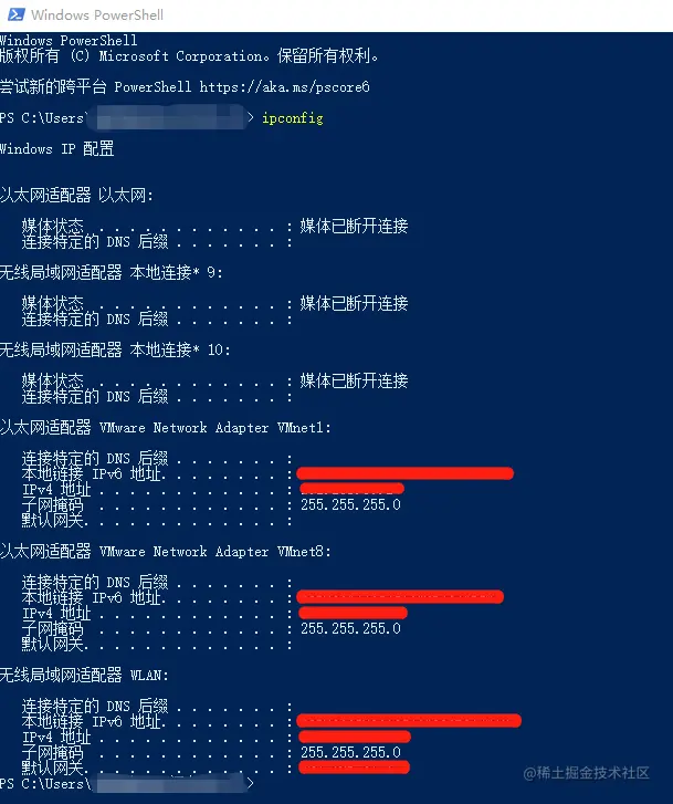 在本地电脑开放3389端口后,我们可以尝试进行远程桌面连接。但首先要知道需要连接的本地电脑的IP地址。要做到这一点,我们可以在需要连接的电脑中,打开powershell并输入命令“ipconfig”