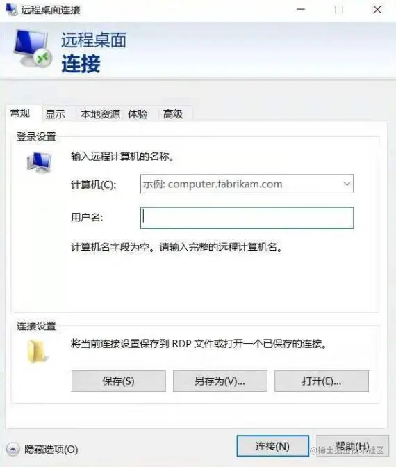 同样,点选远程桌面连接界面左下角的“显示选项”,否则很容易弄错连接设置。