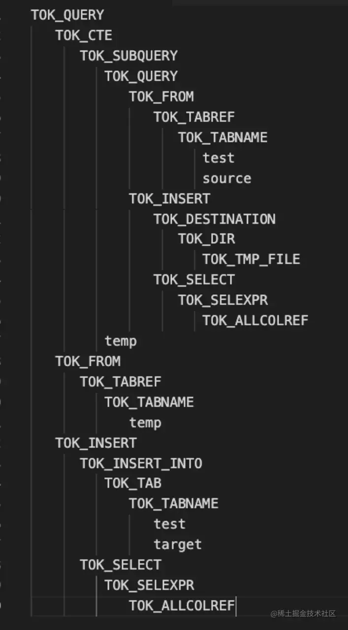 如上图所示hive利用antlr 进行语法和语义解析,生成抽象语法树。举例,如下一段 sql 语句: